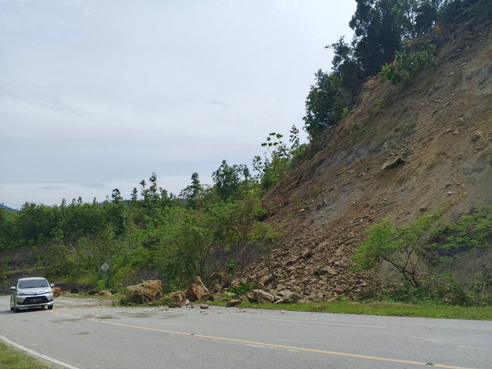 Bahkan sejumlah batu besar telah berjatuhan dan nyaris menutupi badan jalan.